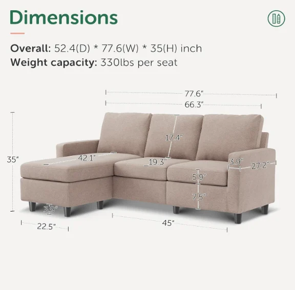 The HONBAY L Shaped Couch is designed for comfort, featuring firm cushions that enhance your seating experience. With a seat depth of 19.3 inches and a height of 17.7 inches, this sectional provides ample support for sitting and napping alike. The sofa can accommodate up to 660 lbs, making it perfect for 2-3 people to relax comfortably.